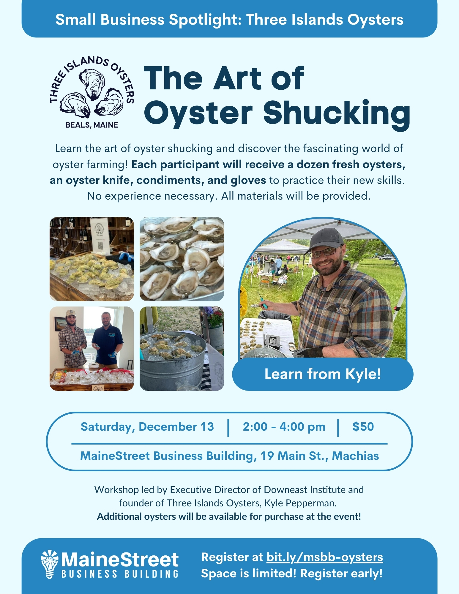 Each participant will receive a dozen fresh oysters, an oyster knife, condiments, and gloves and will learn how to shuck fresh oysters from Kyle Pepperman of Three Islands Oysters and Downeast Institute.