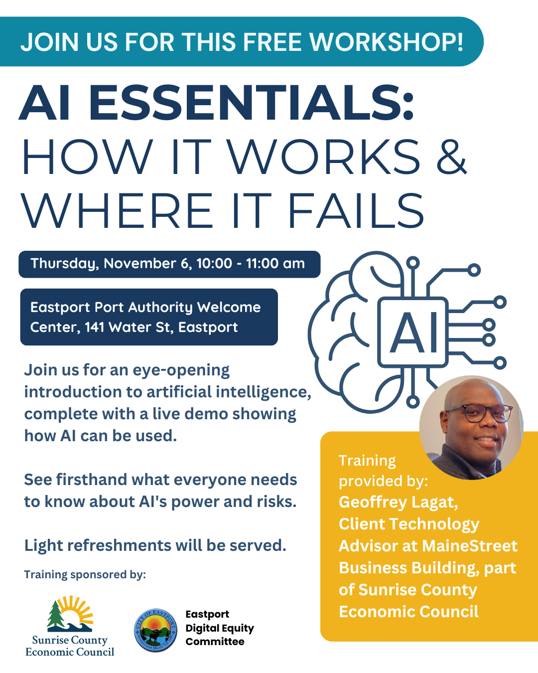 Date: January 6th Time: 11:30 AM - 12:30 PM Location: MaineStreet Business Building, 19 Main Street, Machias Details: Staying safe online is essential in today’s world. This one-hour overview class teaches you how to keep your information and your devices safe. Presented in partnership with the National Digital Equity Center and MaineStreet Business Building. Requirements: All participants must be enrolled […]