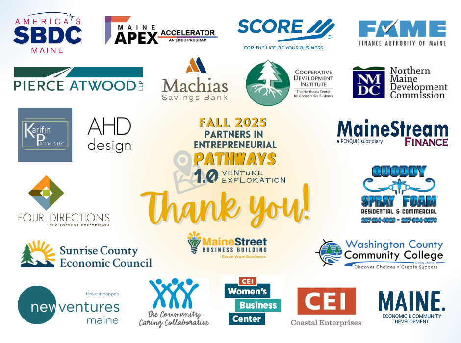 This course is made possible through partnership with Washington County Community College, funding from Northern Border Regional Commission and the Maine Department of Economic and Community Development and more than 50 individual business partners and leaders across the State of Maine who join in delivering our entrepreneurial pathways programs!