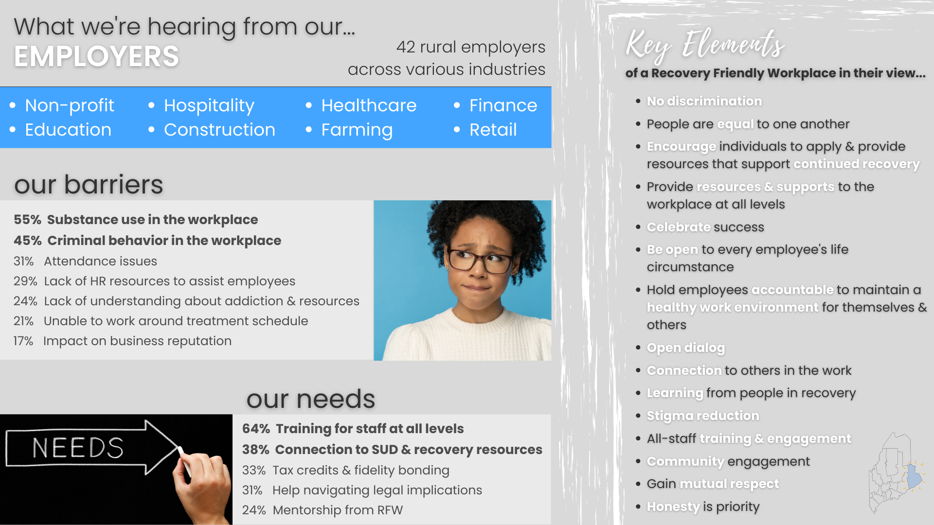 We offer a sincere thank-you to the Maine Community Foundation and the Governer’s Office of Policy Innovation and Future for the invitation to build a Recovery Friendly Workplace initiative with Washington County change-makers!