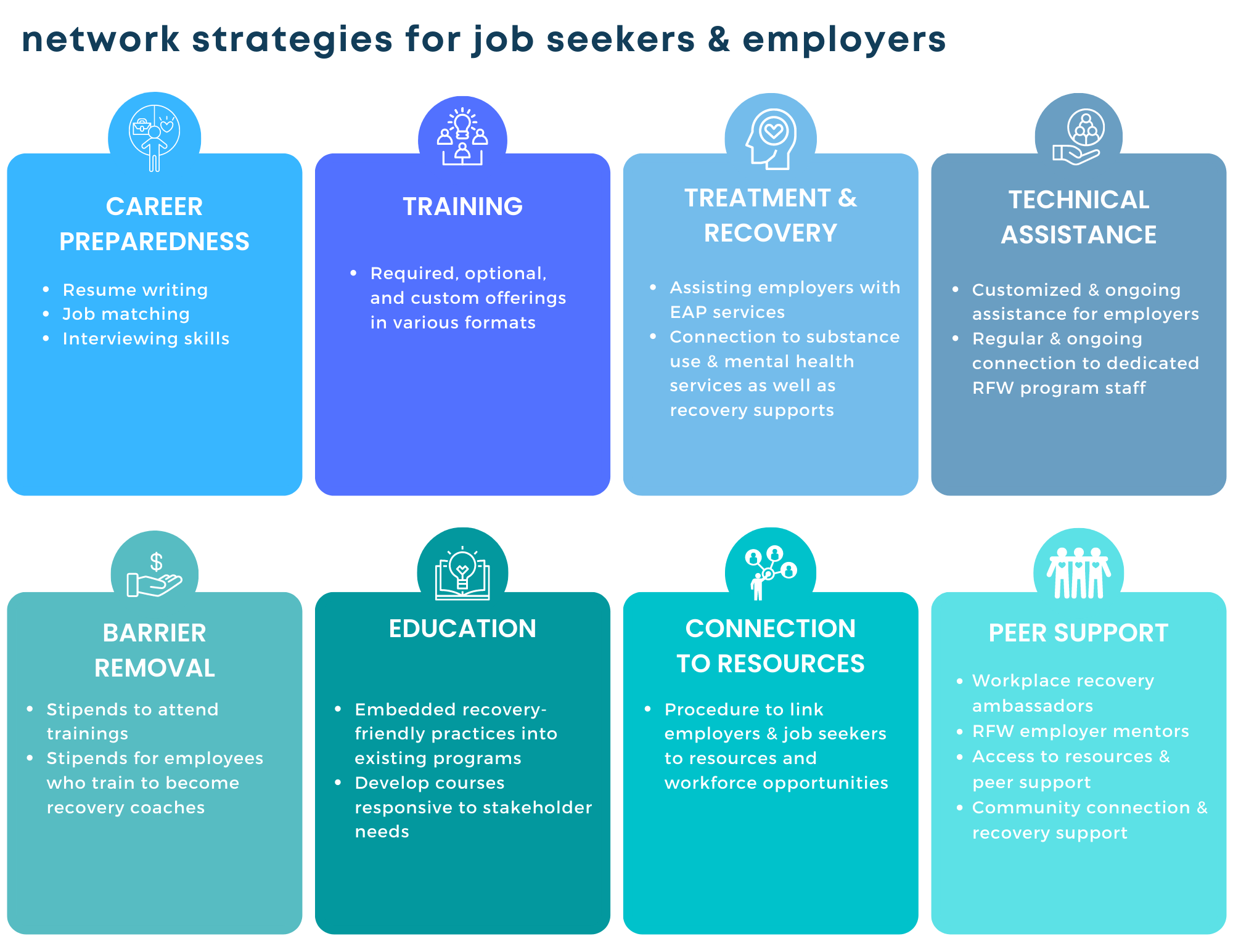 • Staff training on fundamental values of a Recovery Friendly Workplace including Understanding Substance Use & Recovery and Understanding Criminal Records